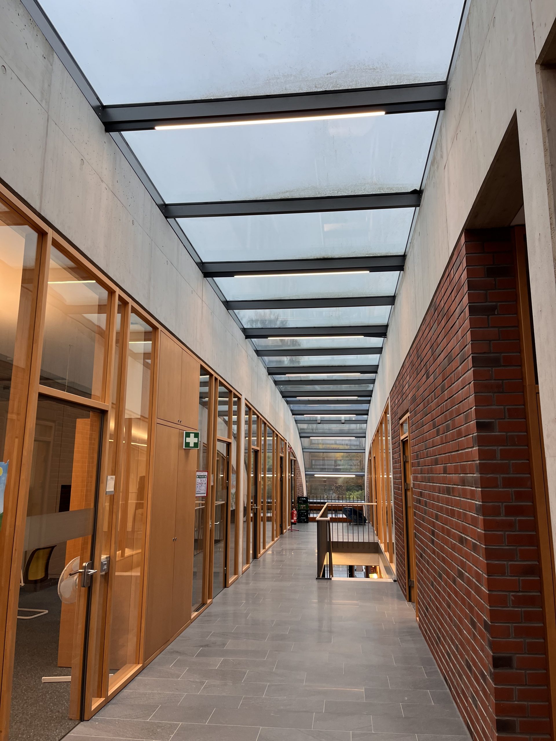 Jede der drei Arbeitsebenen ist so konzipiert, dass je nach Bedarf Büroarbeitsplätze in Großräumen sowie in geschlossenen gläsernen Individualräumen oder Laborräume eingebaut werden können. Bei Bedarf sind auch Logistik oder Produktionsräume möglich. Die metallenen geschwungenen Dach-Ebenen der Riegel setzen kräftige Zeichen. Darunter signalisieren teilweise farbige Glashäute mit vorgelagerten filigranen „Fäden“, Leichtigkeit und Transparenz. Entwässerungskanäle spielen eine große Rolle für die Atmosphäre. Es verschwindet fast nichts unter der Erde, das Erleben von Anwachsen und Schwinden der Wässer verdeutlicht Umweltbewusstsein. Im Übrigen verzögern die umfangreichen intensiven Dachbepflanzungen bei Starkregen den zeitweise anfallenden Wasserabfluss, verhindern also Überschwemmungen.